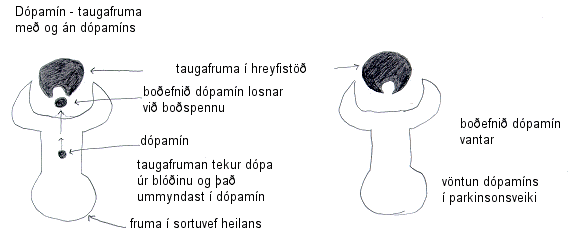 Þegar dópamínnemarnir verða aftur fyrir áreiti hverfur hömlunin og eðlileg hreyfing kemst á að nýju.